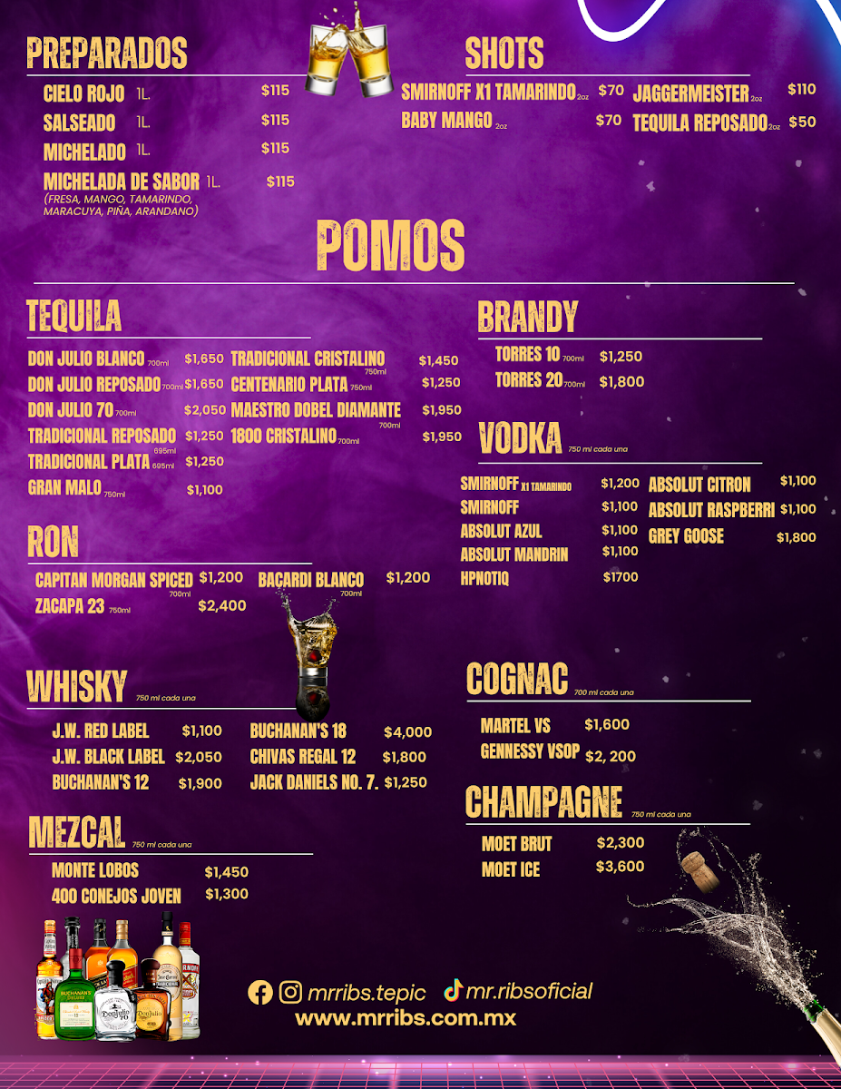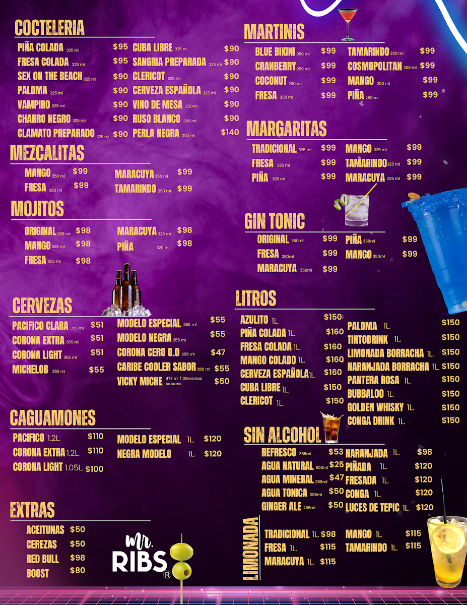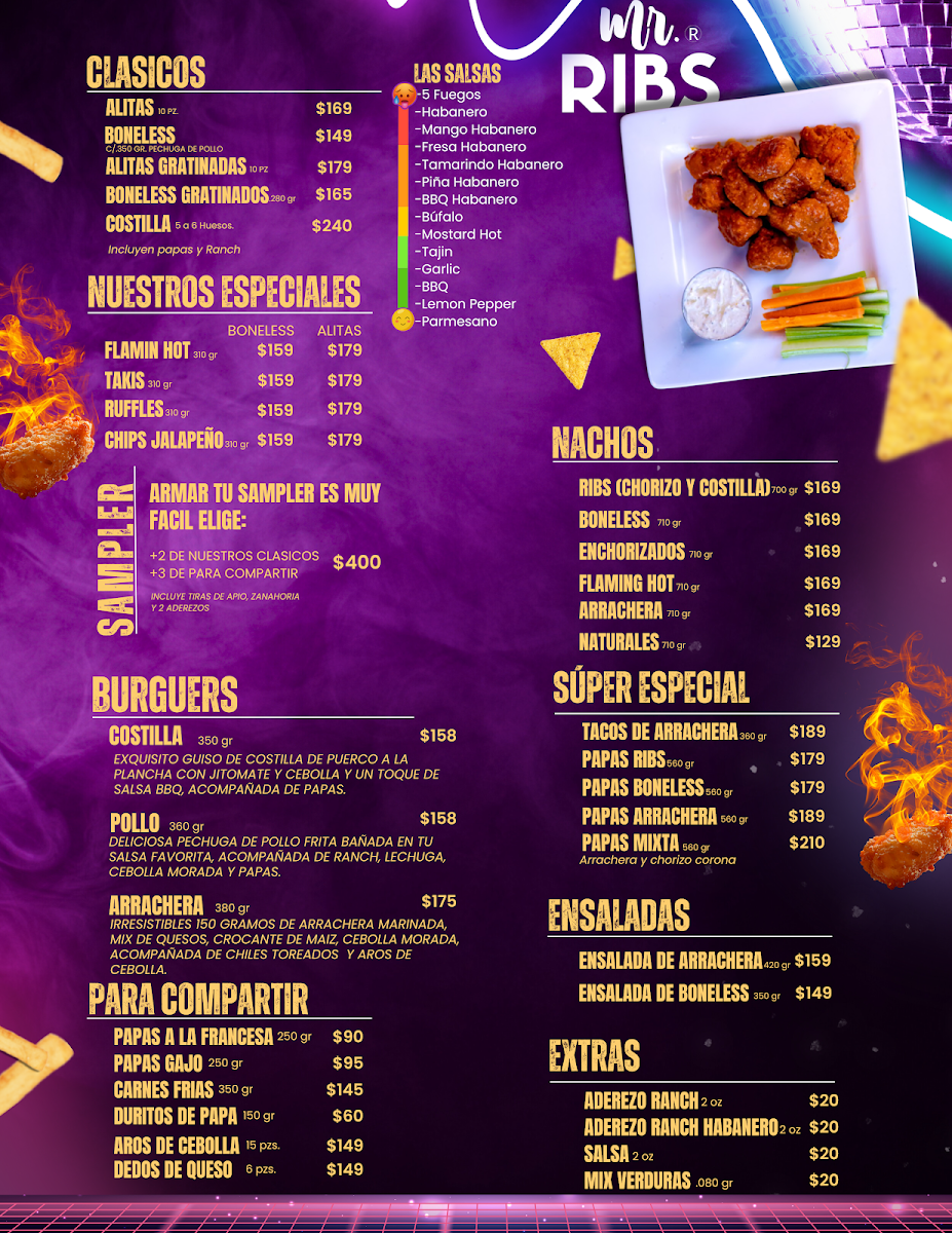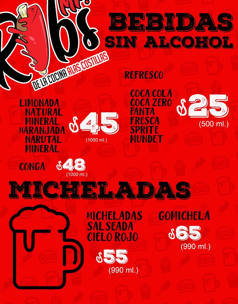Wrapping up my look at the menu at Mr.ribs Tepic (Av Insurgentes 542, Menchaca, 63150 Tepic, Nay., Mexico), it’s clear the restaurant keeps things focused and easy to navigate, especially if you already know what you’re craving. The menu is organized around practical dining options like Entrega a Domicilio (delivery) and Servicio para Llevar (takeaway), which makes it feel built for both quick meals at home and convenient pick-ups. On the food side, the selection centers on hearty comfort favorites: lighter choices appear under Ensaladas, while the more indulgent side of the menu is led by Alitas (wings) and, most importantly, Costillas (ribs)-very much matching the “Mr.ribs” name and vibe. Overall, the menu reads like a straightforward promise: whether you want something fresh, something snackable, or something deeply satisfying, Mr.ribs Tepic positions itself as a reliable spot for wings-and-ribs cravings, with delivery and takeaway options that fit modern, on-the-go eating.